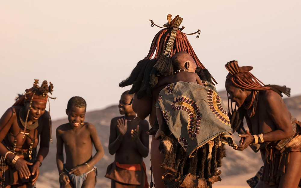 Inland, the desertscape of the Kaokoveld is punctuated by occasional green treelines thirstily following scoured, dry watercourses to the sea. Browsing elephant, giraffe and black rhino are regularly spotted in the river beds, the former often on their hind legs as they reach for favoured ana pods (Faidherbia albida). Be awed by the nomadic people who eke out a living here – the Himba, a pre-industrial culture, cast into this thirstland by their more powerful relatives, the Herero.