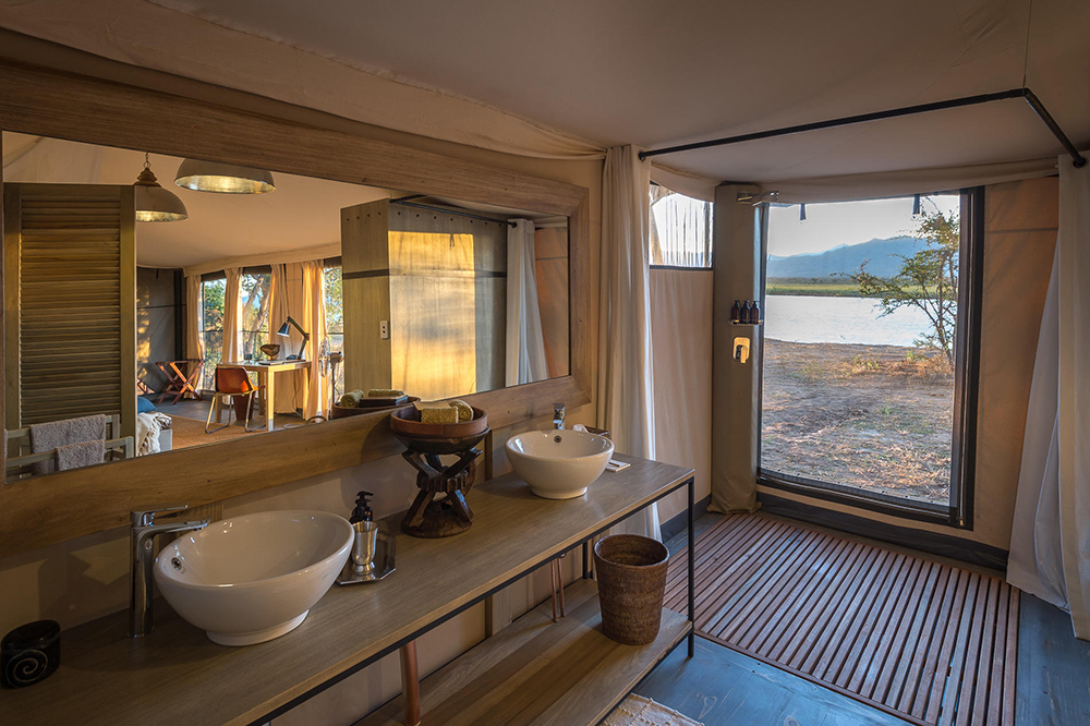 With the Zambezi to its front and a wildlife-laden floodplain to its notably elegant rear, Ruckomechi Camp has a plum position beneath a canopy of acacias casting a spell of Mana magic. Here at Ruckomechi Camp, huge herds of buffalo and elephant rumble by, and lion and leopard sightings are almost as common as its four-finger G&Ts. French linen mixes with greys and blues, and warm smiles match the upward swoop of the grand tented ceilings. If you can tear yourself away from your outdoor shower, this is prime walking safari terrain and sunrise canoeing on the Zambezi is not to be missed. But for the love of Nyami Nyami*, don’t drop anything overboard! You can pretty much kiss it goodbye.