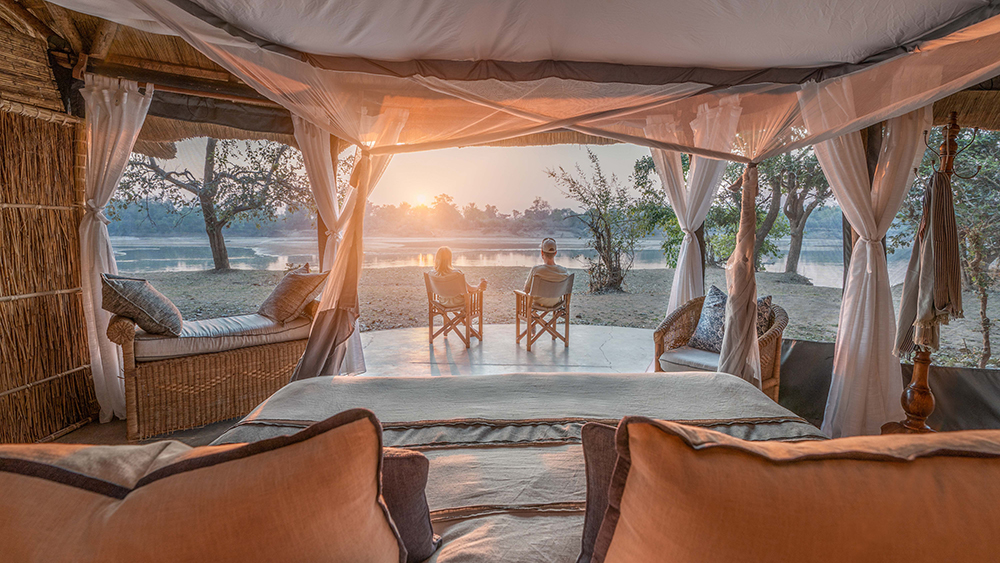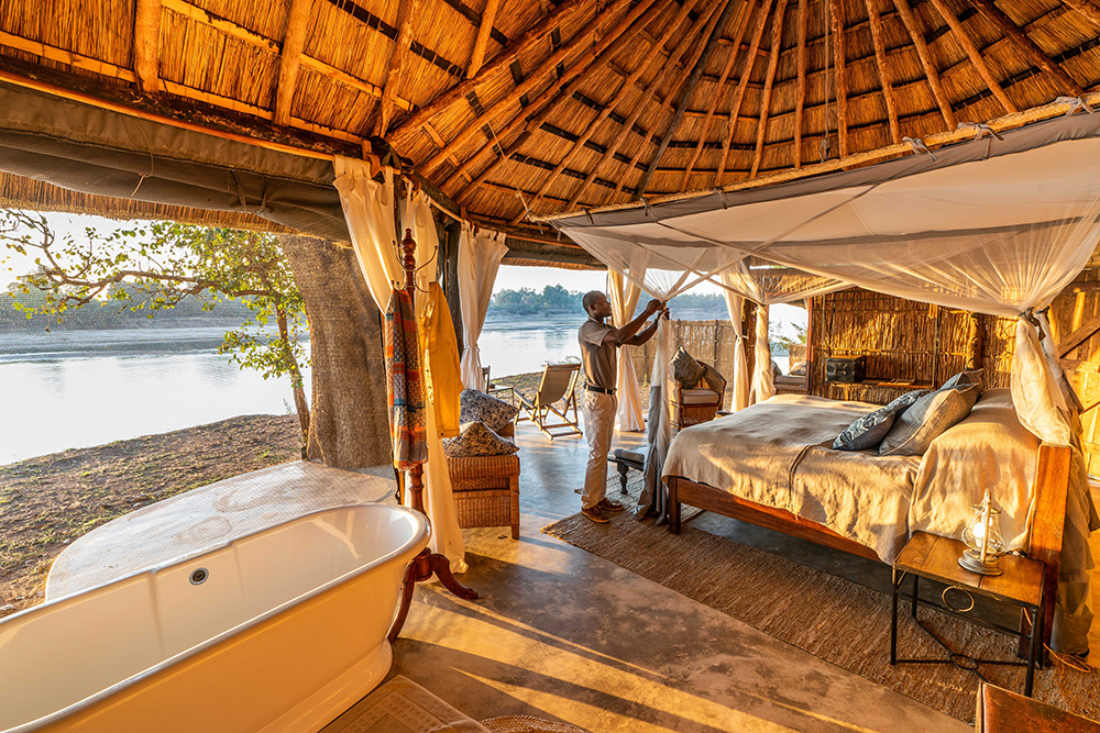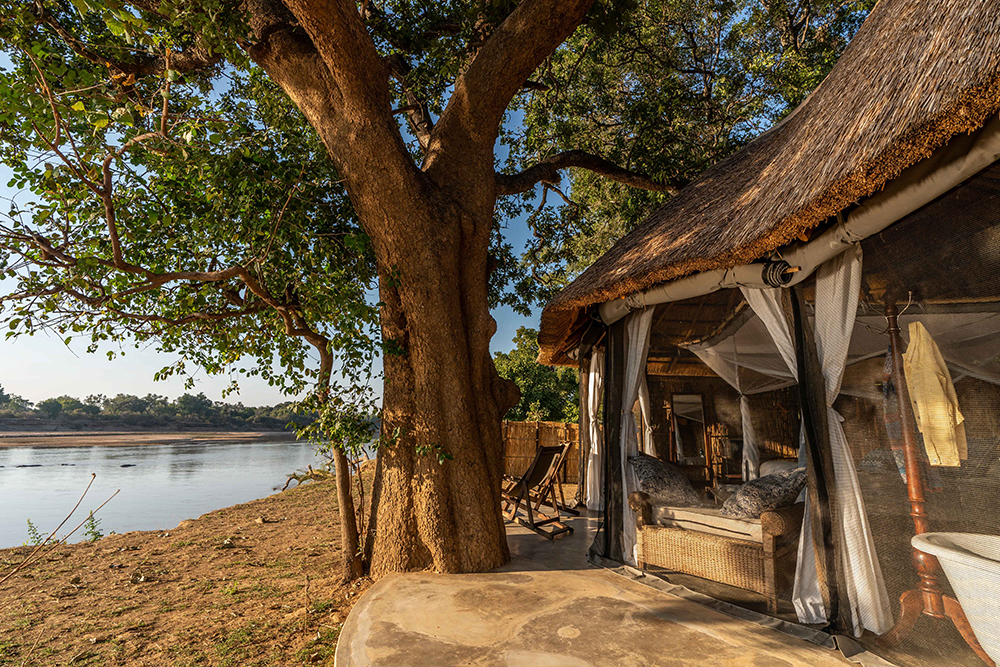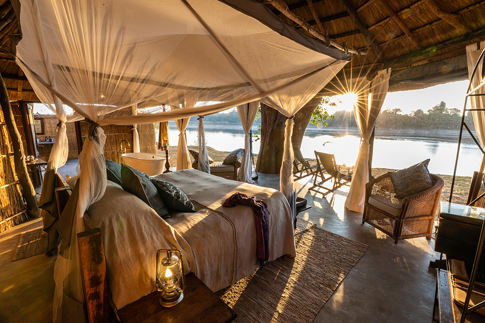 On the banks of the Hippo-laden Luangwa River lies Mchenja, this heavenly slice of ebony-clad, off-grid chic. No matter how frantically you wave your phone around, there’s not a single bar of signal to be found. (Waving for a single malt is an entirely different story.) Lather up in the privacy of your open-air, reed-wrapped bathroom, hit the bush on foot*, or hold onto your wide-brimmed hat as you zoom off in search of big cats looking to picnic on puku. Come armed and loaded to Mchenja: There’s not a single turn you’ll take when you won’t be reaching for your camera.