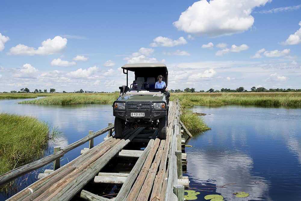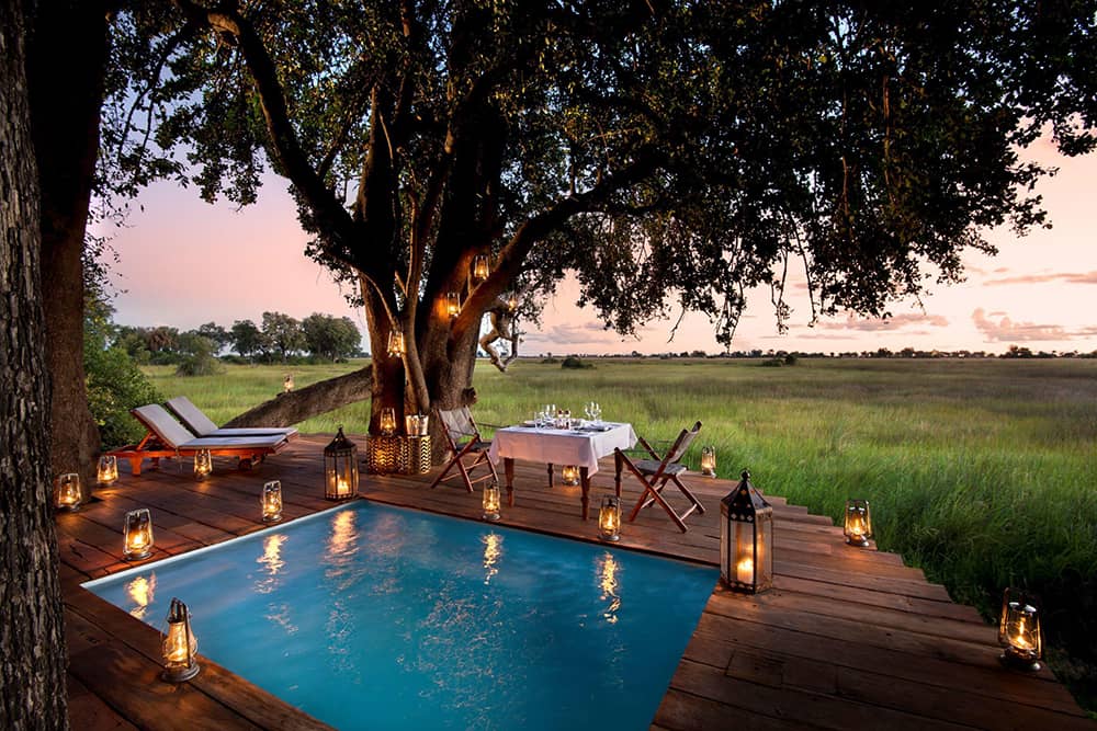 Duba Plains is in the northern part of the Okavango Delta and home to large herds of buffalo. (Some sightings report herds up to 600 buffalo strong.) You may never want to leave your luxurious room but that’s okay because there’s a constant stream of wildlife passing by. Boating is seasonal and activities are mostly focused on 4×4 game drives.