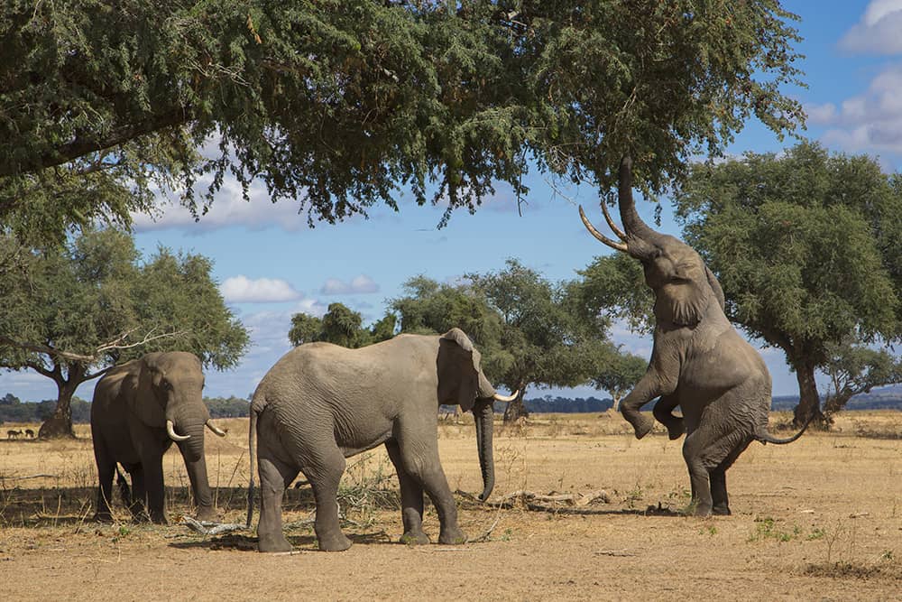 Beyond Kariba’s dam wall along the banks of the Lower Zambezi, you’ll find Mana Pools. With its termite mounds, dappled shade and hindleg-balancing elephants reaching for tasty treats in the canopy above, this is one of Zim’s best-loved African safari experiences. Its banks are crowded with hippo, buffalo, antelope, wild dog, leopard, enormous crocodiles and tufts of adrenalin grass – so called for its anxiety-inducing ability to conceal hungry lions and grumpy daga boys (older male buffalos).